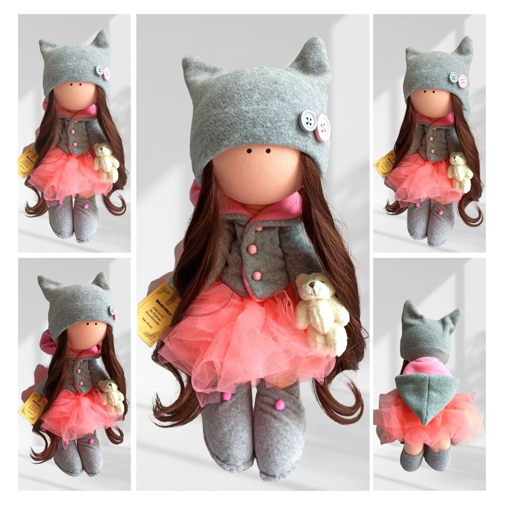 You will create a 33 cm (13 inches) textile doll. Inside this document, you will have Body pattern, arms and legs pattern, also the patterns for clothes are included( hat and shoes). Once you will finish the complete body, the rest of the work will be a pleasure. All you will have to do is to add the hair, a funny hat with kitten ears and the most cute skirt.